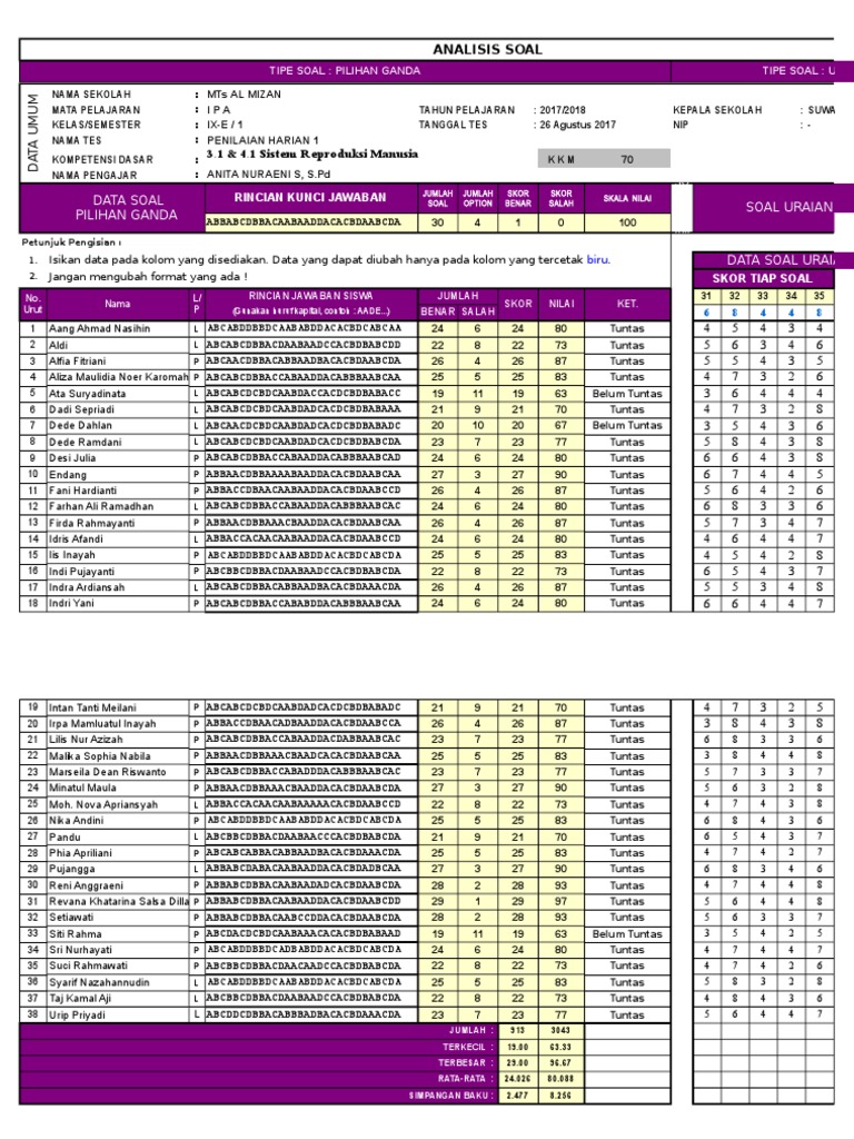 I ANALISIS BUTIR SOAL ULANGAN UMUM SEMESTER GANJIL MATA PELAJARAN IPA MTs N 1 RASAU JAYA TAHUN AJARAN 20142015 OLEH. Selain itu aplikasi analisis nilai ulangan harian perbaikan pengayaan sd slta ktsp ini telah dikemas sedemikian rupa sehingga sangatlah mudah dipergunakannya. Adapun kelengkapan dari analisis hasil ulangan harian antara lain soal ulangan lengkap dengan kisi-kisinya bukti pengumuman ulangan harian dan daftar hadir remidipengayaan.