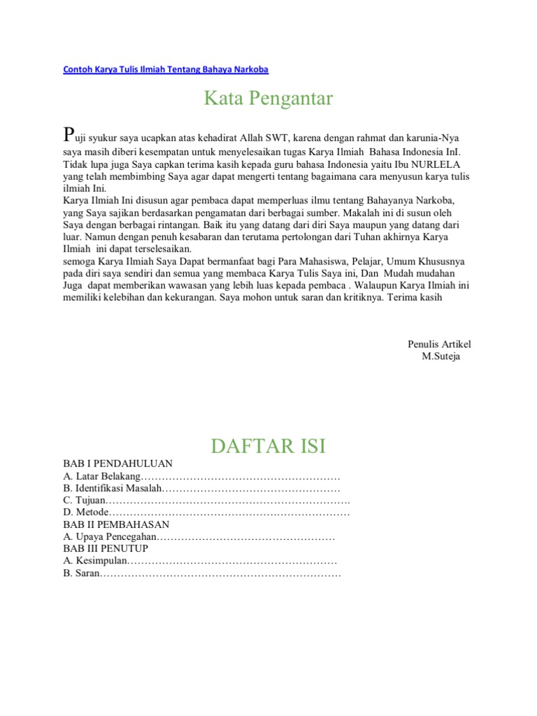 Karya karya tulis ilmiah ini berasal dari peserta dari kategori. Contoh karya tulis ilmiah populer sederhana formal non formal tentang pendidikan sampah pergaulan bebas pencemaran air bahaya rokok narkoba kesehatan kenakalan remaja lingkungan yang baik dan benar. Disini akan kami jelaskan tentang jenis-jenis narkoba yaitu diantaranya adalah.