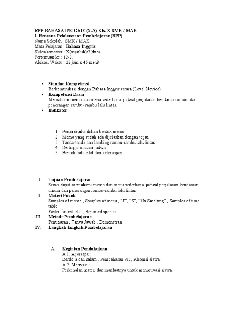 Bahasa Inggris Kelas. Download RPP Bahasa Inggris KTSP SMK Kelas XI smt 1 dan 2. 20 x 45 menit 10 P ertemuan Standar kompetensi.