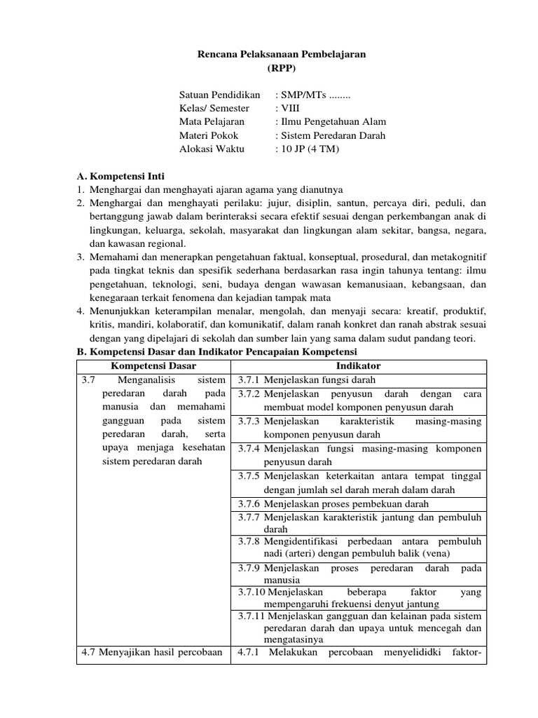 Rencana Pelaksanaan Pembelajaran Rpp Sistem Peredaran Darah