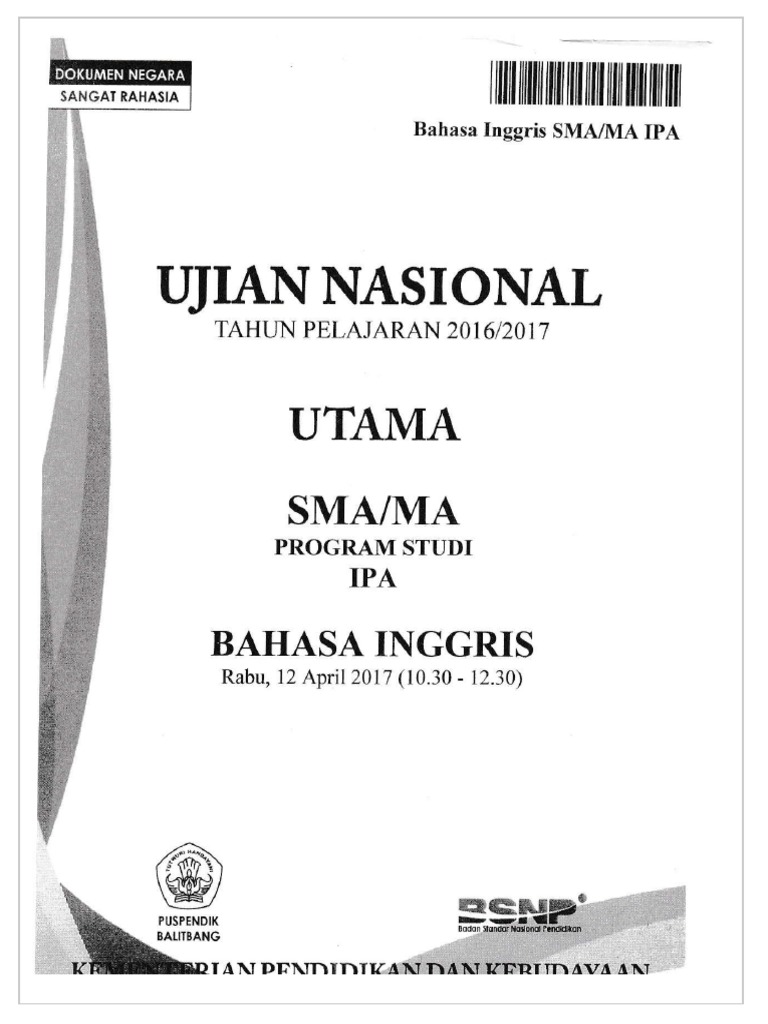 Unggahan paket soal bahasa inggris ini bisa digunakan untuk pembelajaran untuk semua program studi walaupun di kop kanan atas tertulis bahasa inggris sma ma ipa ips bahasa. Berikut ini adalah paket soal yang diujikan pada UN Bahasa Inggris SMA IPA Tahun 2013. Download soal ukg 2015 bahasa inggris sma dan kunci jawaban.