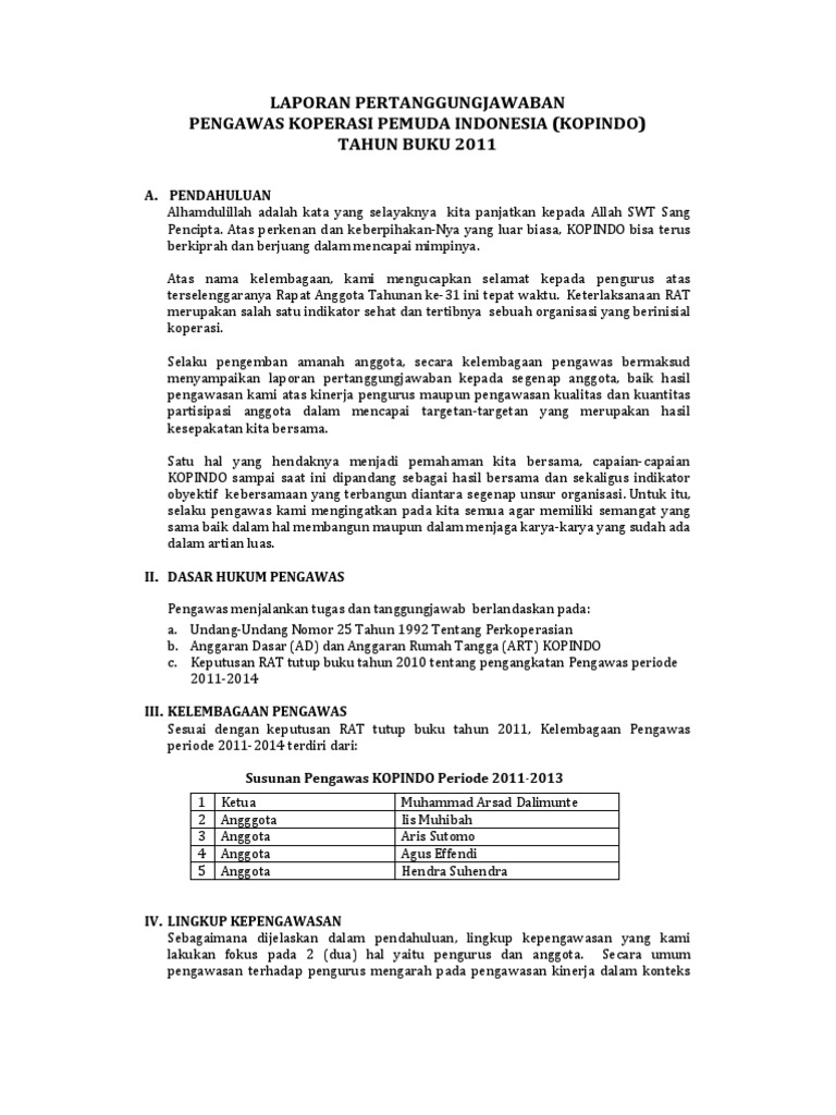 Sedangkan untuk permodalan koperasi Ceria berasal dari modal sendiri anggota yang berupa simpanan pokok dan simpanan wajib anggota. Laporan pertanggungjawaban pengurus dan pengawas koperasi kawanmu badan hukum. Laporan badan pengawas karena 10 tahun tidak pernah ada RAT dan pengurus hanya satu orang yang aktif inipun pembelajaran bagi anggota yang lain by ujangketul62 in KOPERASI badan pengawas laporan badan pengawas karena 10 tahun tidak pernah ada RAT dan pengurus hanya satu orang yang aktif inipun pembelajaran bagi anggota yang lain.